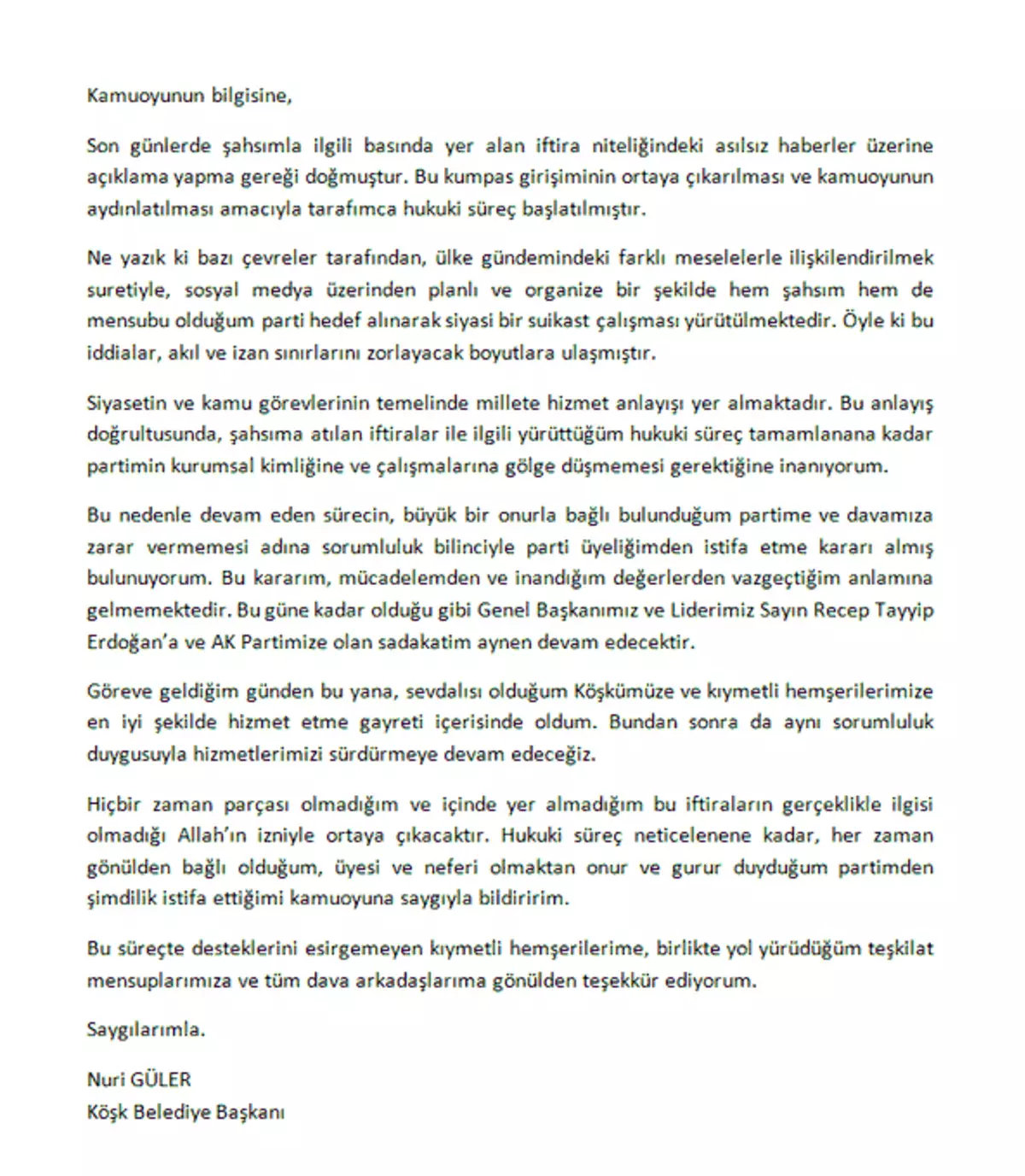 Yaşanan gelişmelerin ardından Nuri Güler, sosyal medya hesabı üzerinden yaptığı açıklamayla AK Parti üyeliğinden istifa ettiğini duyurdu. Güler’in belediye başkanlığı görevine ilişkin nasıl bir yol izleneceği ise merak konusu oldu.