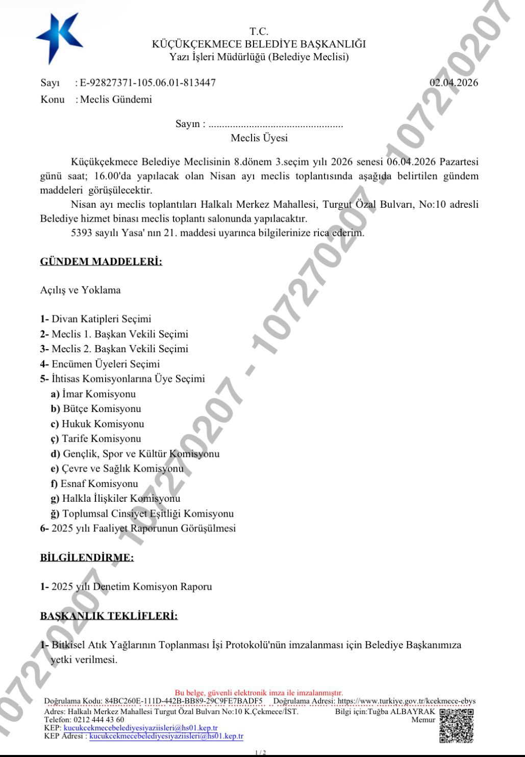 Başkan Vekilliği Seçimlerinde Dikkat Çeken Değişim Küçükçekmece Belediyesi 2026 yılı Nisan ayı birinci meclis toplantısı, bugün saat 17.00’de Küçükçekmece Belediye Meclis Salonu’nda gerçekleştirildi. Toplantıya, Belediye Meclisi 1. Başkan Vekili Gökhan Gümüşdağ başkanlık etti.